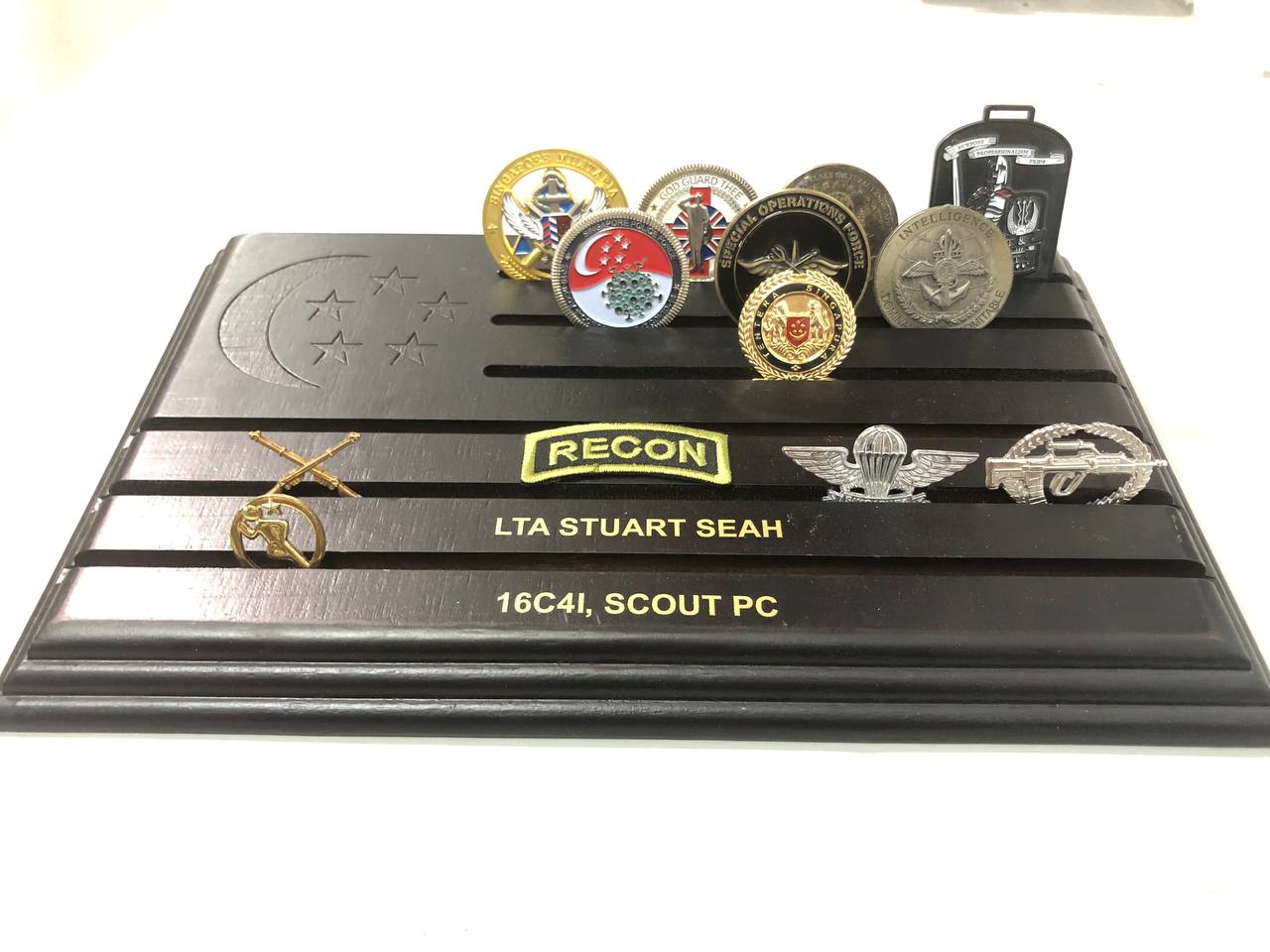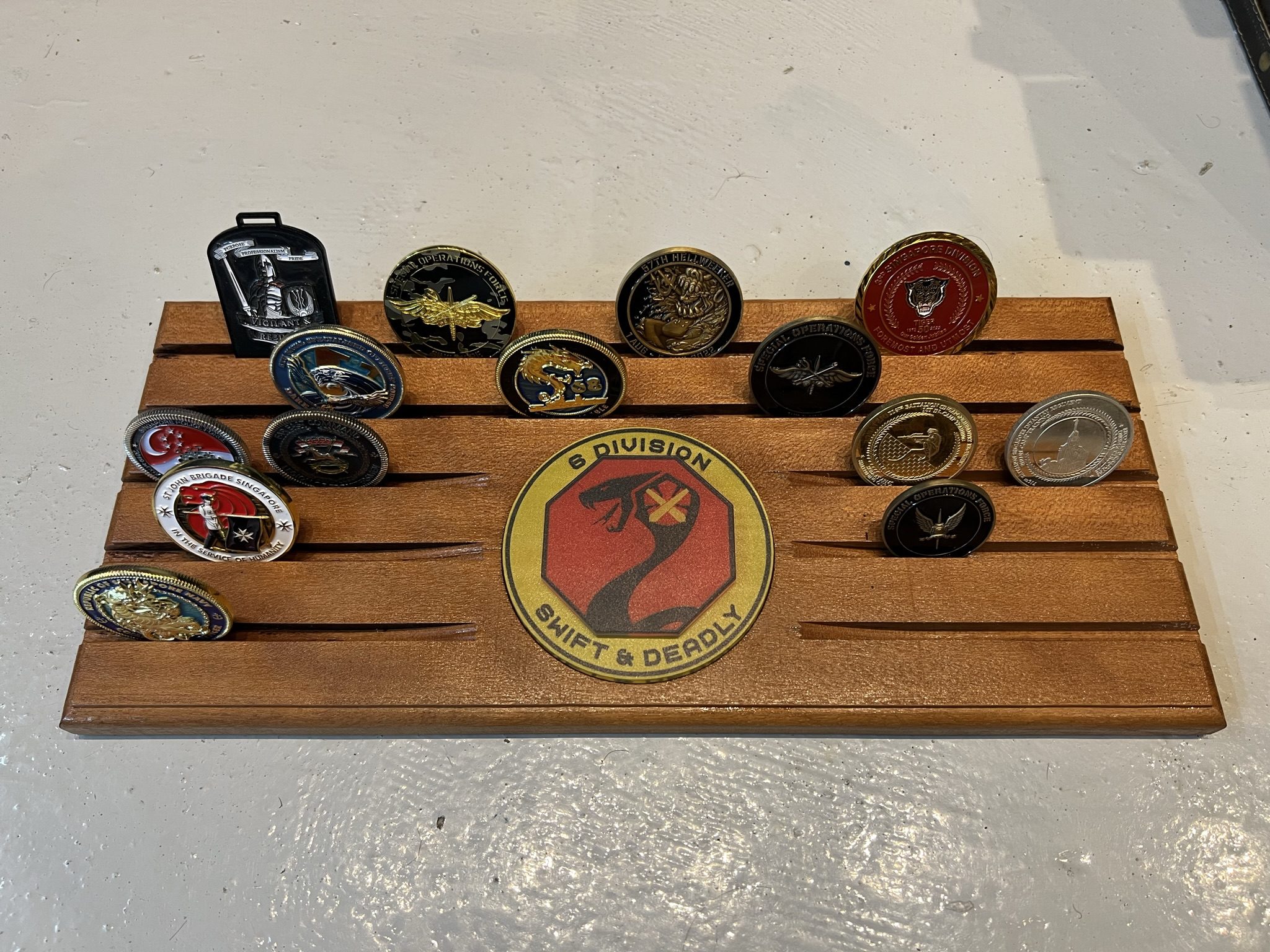 A Wooden coin display holder for all your military challenge coins and medallions.